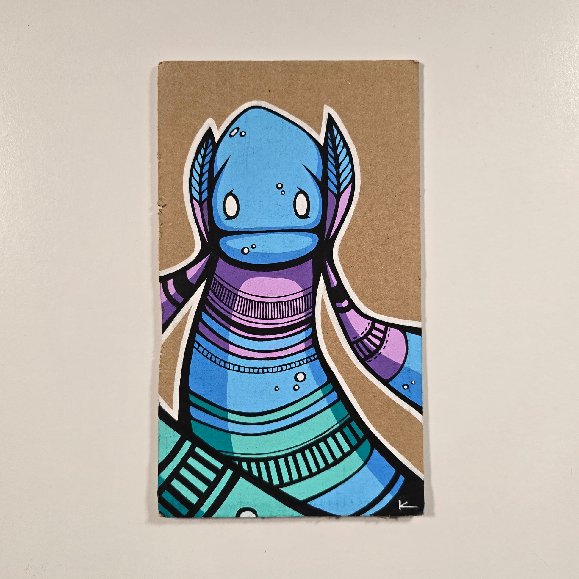 Four is a richly detailed Korpworm brought to life in vibrant shades of violet, blue, and aqua green. The intricate linework running through its body and arms adds depth and texture, while the downcast expression hints at quiet sadness beneath the colour. The mix of bold hues with a somber mood makes this piece both visually striking and emotionally layered.
