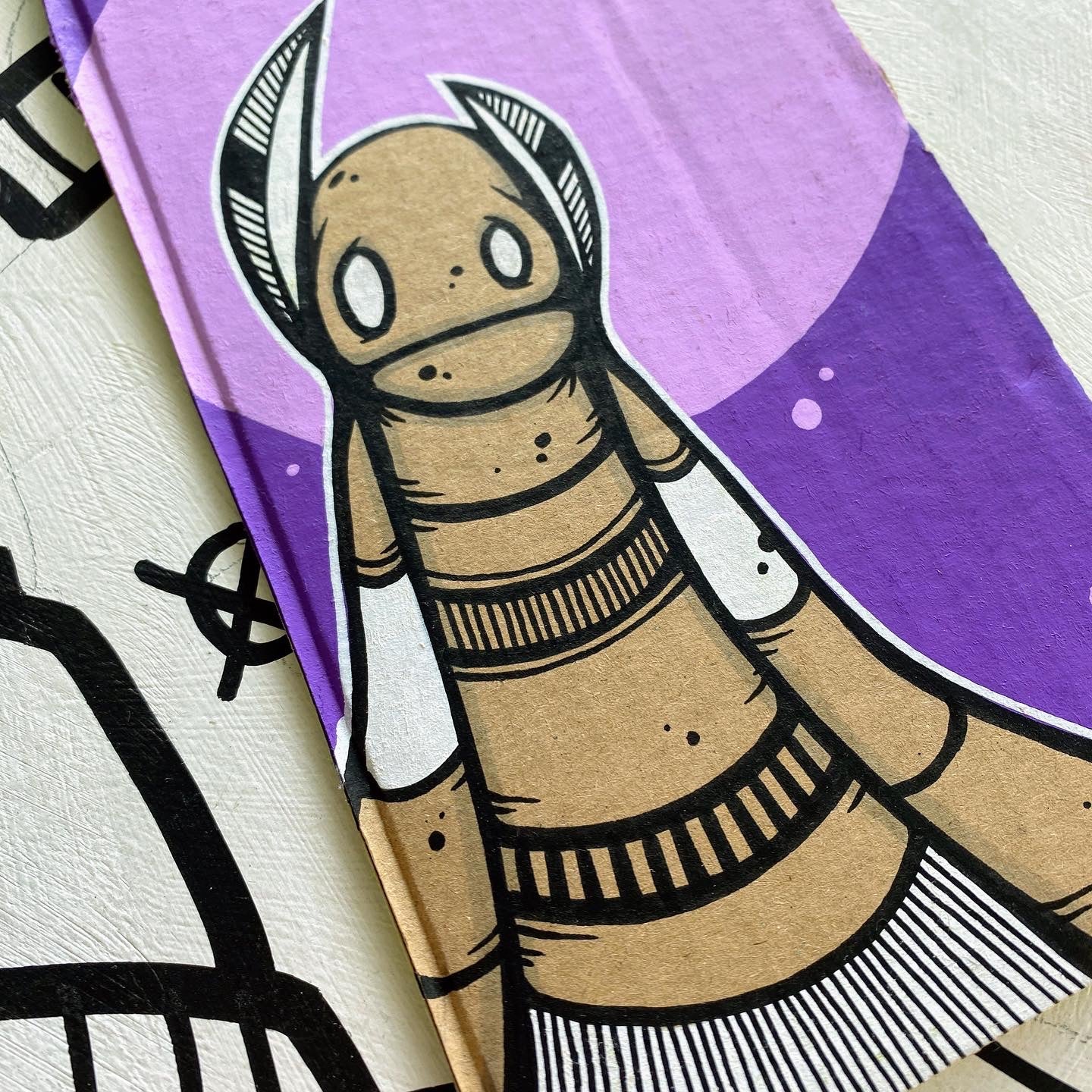 In Melancholy, a lone Korpworm sits against a moody violet sky beneath the glow of a lavender moon. The character’s sad eyes and still posture give the piece a quiet, reflective quality—equal parts strange and tender. Drawn primarily with Posca pens, subtle shading from alcohol markers deepens the tones, adding softness and depth to the scene.